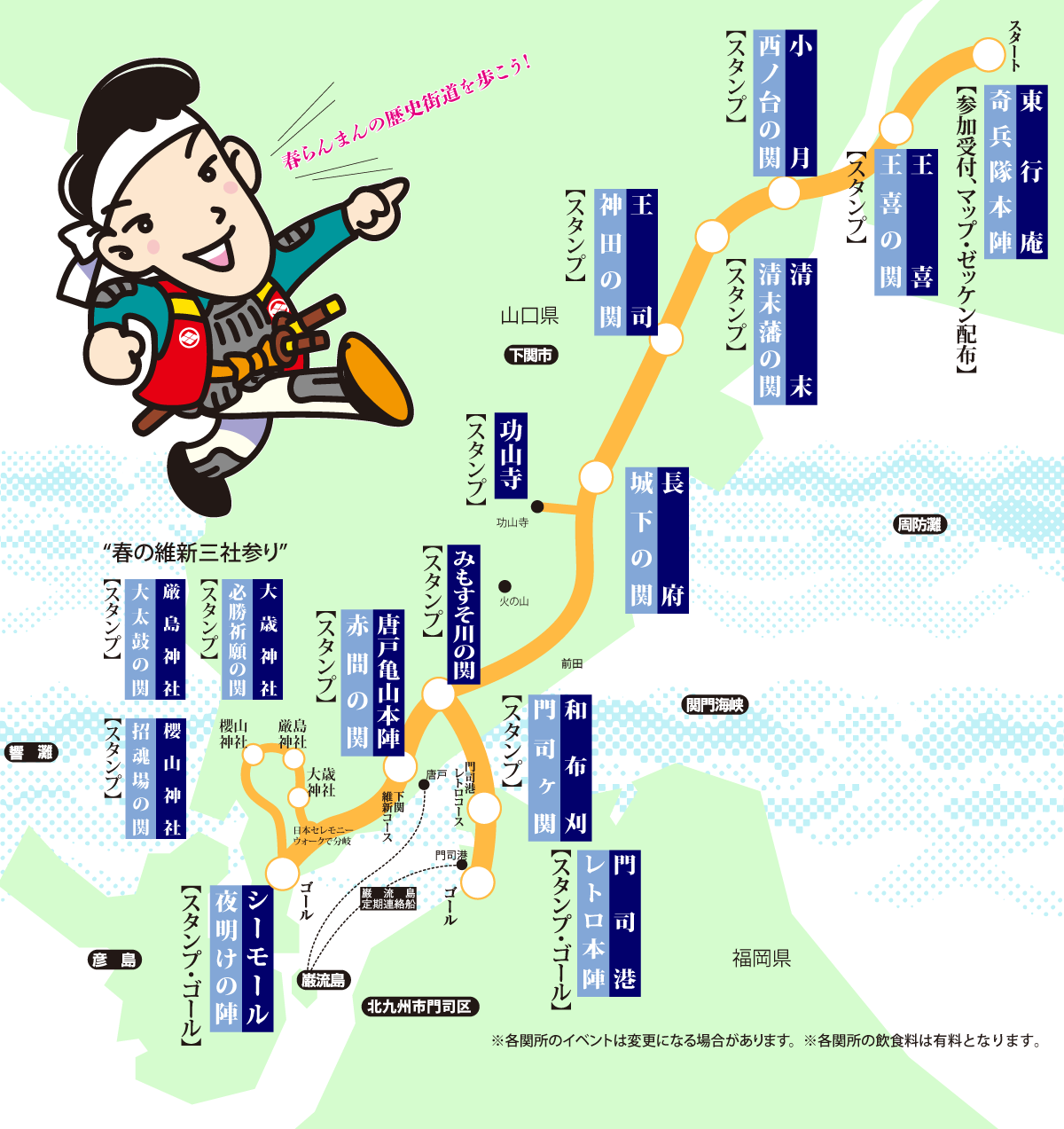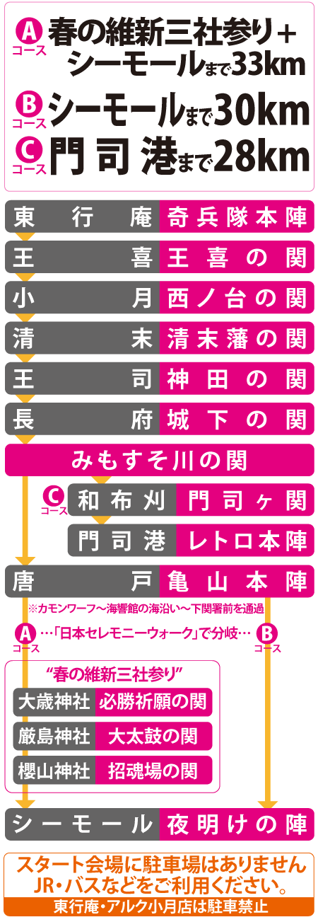 スタート会場に駐車場はありません。JR・バスなどをご利用ください。東行庵、アルク小月店は駐車禁止です。